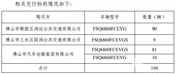 2019年3月20日,美锦能源(000723)发布公告称,截至本公告披露日,公司旗下控股子公司佛山市飞驰汽车制造有限公司(下称“飞驰汽车”)向佛山市顺德区鸿运公共交通有限公司、佛山市三水区国鸿公共交通有限公司、佛山市汽车运输集团有限公司合计交付 190 辆氢燃料电池城市客车。