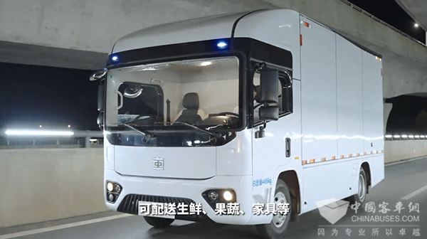 可配送果蔬、生鲜、家具、商超等货物,货厢容积达18立方。装载了80.14度电池包,续航里程200公里以上。不同于市面上其它物流车,它的车顶与货厢是一体化设计;驾驶室、货厢及外饰件采用铝材质,整车减重>250kg 。