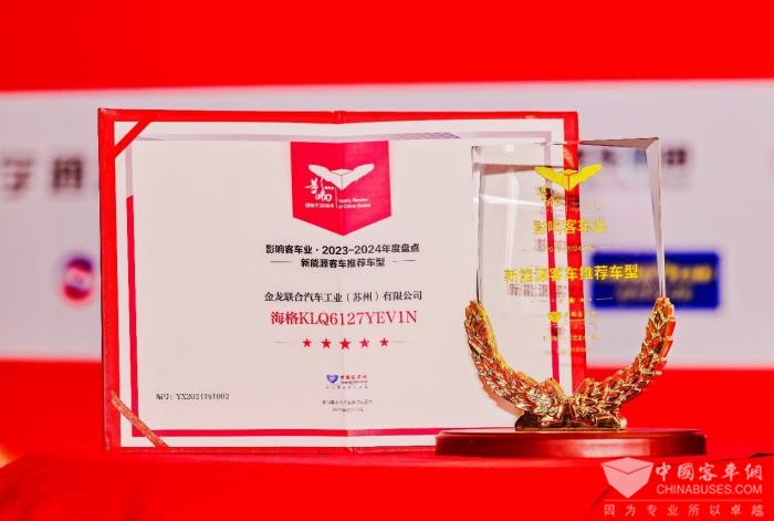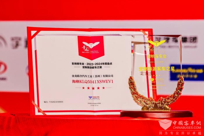 2024年1月19日,第十八届影响客车业年度盘点颁奖典礼在合肥举行。活动期间,众多奖项如期揭晓,经组委会评审团评定,苏州金龙海格睿星KLQ5041XSWEV1、旅行家KLQ6127YEV1N分别荣获“定制旅游客车之星”大奖和“新能源客车推荐车型”大奖。苏州金龙获得两款产品大奖,不仅诠释了自身过硬的产品实力,也展示了企业品牌的强大影响力。