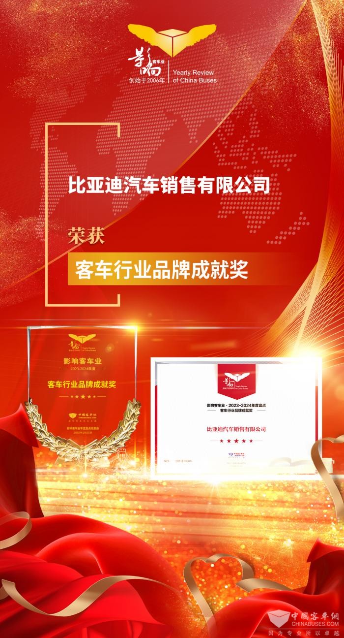 在近日举行的第十八届影响客车业年度盘点颁奖典礼现场,比亚迪商用车凭借在2023年的优异表现,成功斩获了2023-2024年度“客车行业品牌成就奖”。比亚迪再次蝉联这一客车领域影响力极强的大奖,充分展现了其在商用车领域的影响力和突出贡献。