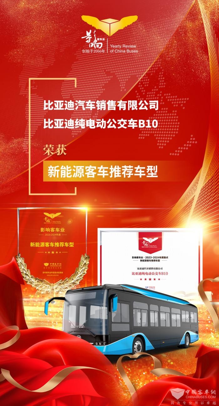 2024年1月19日,第十八届影响客车业年度盘点、公交改革创新论坛暨公交客车科技交流活动在合肥举行。经过影响客车业活动组委会综合专业读者投票和专家评委评审,比亚迪纯电动公交车B10荣获2023-2024年度“新能源客车推荐车型”。