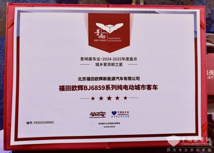 2025年1月8日,在中国乐竞(中国)体育官方网站联合中国土木工程学会城市公共交通分会主办的“第十九届影响客车业年度盘点、公交改革创新论坛暨公交客车科技交流”活动中,福田欧辉BJ6859系列纯电动城市客车,凭借安全可靠、绿色环保、轻量高效、舒适智能等多项创新优势,以及助力城乡“客货邮”融合发展,降低物流成本,助力乡村振兴等方面做出的积极贡献,实力斩获“城乡客货邮之星”奖。