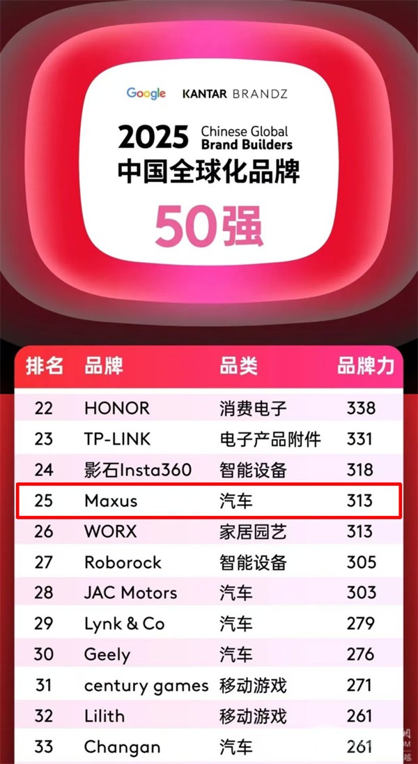乐竞(中国)体育官方网站2025年6月24日获悉,Google与全球领先的品牌数据与分析公司凯度联合发布《2025凯度BrandZ中国全球化品牌》榜单,不仅展现了中国品牌在全球化进程中影响力的进阶轨迹,更以权威视角为行业提供了洞察全球市场竞争格局的重要参考。上汽大通MAXUS凭借强劲的品牌影响力与全球化布局,位列第25位,同时,凭借差异化产品矩阵和新能源技术优势,位居汽车品类第4位,整体排名和汽车类排名都比去年上升了一名,成为中国品牌全球化进程中的重要标杆。