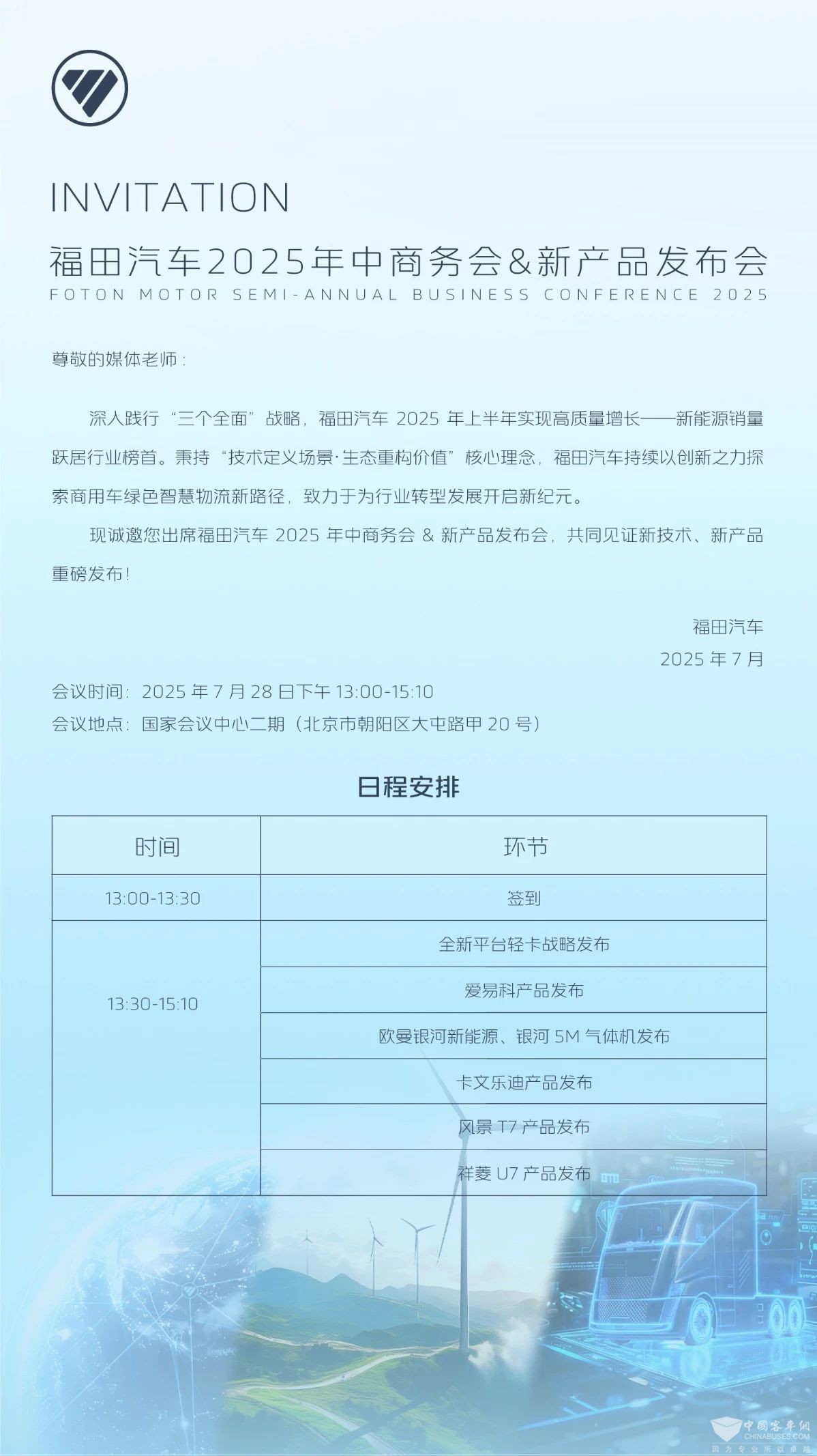 上半年在新能源赛道的强势领跑,不仅为福田汽车积累了坚实底气,更让其绿色转型的步伐愈发坚定。而这一系列成果,只是其绿色跃迁征程的序章。7月28日,一场聚焦绿色未来的行业盛典——福田汽车新品发布会即将震撼启幕,六大新能源新品将集体亮相,用技术突破与场景创新延续上半年的强劲势头,为商用车行业带来一场绿色升级的盛宴。