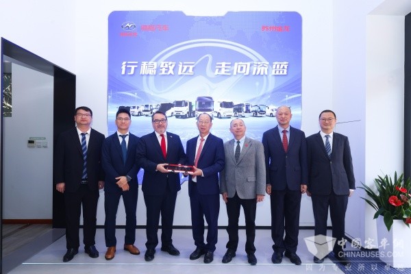 苏州金龙总经理黄书平(左四)向智利驻华大使阿里亚兰(左三)赠送车模