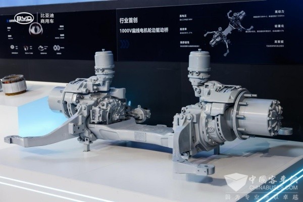 为了适配1000V的高压架构,比亚迪开发了全球最高的1500V碳化硅功率芯片,最高效率提升至99.84%。同时,比亚迪还首创了客车1000V电驱桥,采用高压扁线电机、陶瓷球轴承、主动润滑等技术,高效区扩大了50%,最大效率提升至95.27%。