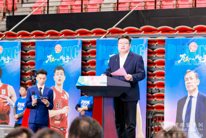 北汽集团党委常委、副总经理常瑞出席誓师大会并发表致辞。他表示,自2023年8月北汽集团与首钢篮球俱乐部达成战略合作以来,已并肩走过两个赛季。相同的精神理念,让我们共同完成了这场通往信念与荣耀的“双向奔赴”,共同践行着“为北京而战,向冠军而行”的誓言。同时,今年也是北汽集团“三年跃升行动”的开局之年,迎接新赛季的挑战,北汽集团将继续以优质的产品、创新的技术和贴心的服务,作为北京北汽男篮最坚强的后盾,与球队并肩前行,共创辉煌。随后常瑞代表北汽集团向北汽男篮队长赠送福田大巴车模。