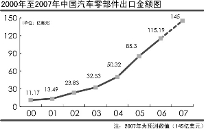 中国汽车工业咨询委员会委员陈光祖预测:“2007年,中国汽车零部件出口额约145亿美元,再创历史新高。”