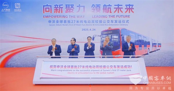 2025年4月24日上午,在春意盎然的美好时节,一场备受瞩目的仪式在热烈的氛围中拉开帷幕。申沃全球首款27米纯电动双铰接公交车发运仪式在上海海通国际汽车码头盛大举行。上汽国际业务事业部、上海申沃客车、上汽国际墨西哥公司、上汽商用车国际、上海海通国际汽车码头、外高桥海关、边检、公安领导出席本次活动,共同见证这一具有里程碑意义的时刻。