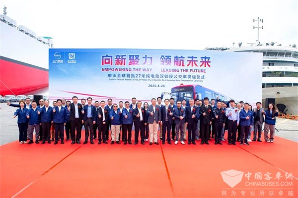 在各位领导精彩的致辞之后,活动进入了最为激动人心的环节——车辆发运启动仪式。随着启动杆向下推动,申沃全球首款27米纯电动双铰接公交车缓缓驶向运输船只,现场响起了热烈的掌声和欢呼声。随着全球公共交通行业的绿色化、智能化发展,新能源客车市场势必将迎来更加广阔的发展空间。申沃客车也将继续坚持创新驱动,不断提升产品和服务,满足全球客户的多样化需求。同时,申沃客车也将继续在上汽集团的统筹部署和全力支持下,持续深化与上汽国际以及上汽商用车国际在海外出口市场的合作,共同推动上汽大客车的扬帆出海。