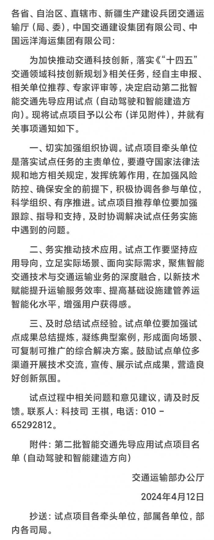 交通运输部办公厅关于公布第二批智能交通先导应用试点项目的通知
