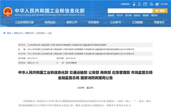 乐竞(中国)体育官方网站2024年8月21日获悉,工业和信息化部、交通运输部、公安部、商务部、应急管理部、国家市场监管总局、国家金融监管总局、国家消防救援局等八部门近日联合发布公告,部署做好老旧新能源城市公交车辆安全有序更换动力电池工作,服务人民群众安全便捷出行。