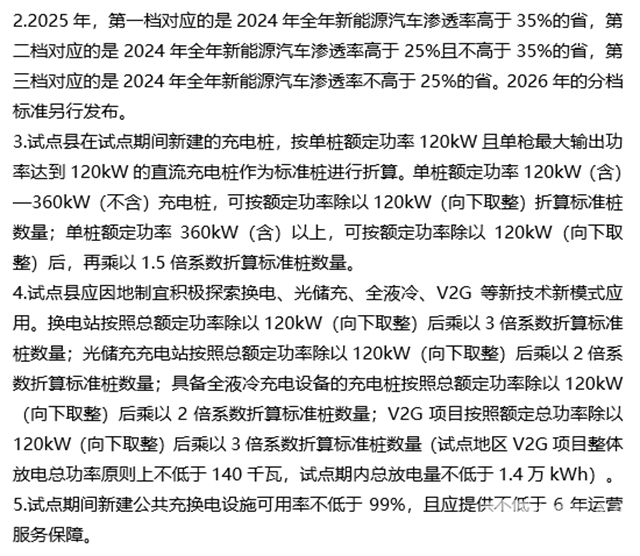 三、鼓励新技术应用。对试点地区具有明显示范效应的车网互动(V2G)项目(试点地区V2G项目整体放电总功率原则上不低于140千瓦,试点期内总放电量不低于1.4万千瓦时),可按照项目总功率除以120千瓦(向下取整)的3倍系数进行标准桩数量折算,折算的标准桩计入首次达到政策指标要求的年度(2024年通过备案的第一批67个试点县参照执行)。