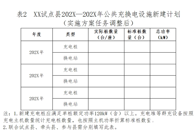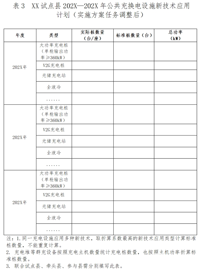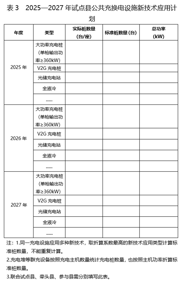 六、关于其他申报要求。各省应按照《试点通知》有关要求,组织试点县编制试点申报实施方案(实施方案正文继续按照《试点通知》附件1,实施方案附表按照本通知附件3)。进一步加强县域充换电设施与农村公路等交通基础设施及其沿线配套设施的衔接,拓展应用场景,并统筹考虑新增公共充换电设施与既有设施的空间布局,避免重复建设,有效提升利用率。试点县可研究适当增加电动重卡充换电设施,支持重卡加快电动化。各省通过竞争性评审的方式择优确定本省试点县名单,并于2025年3月13日前将试点县名单及试点实施方案按程序上报三部门备案,相关材料电子版一并上传至清算平台。