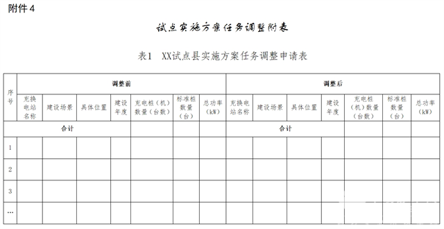试点县原则上应严格按照实施方案推进试点相关工作,确因土地征用、电力改造以及不可抗力等因素无法完全按照已备案的实施方案(含第一批试点县)实施的,可在不减少公共充换电设施总数量(标准桩)和实际总功率目标的前提下,申请对实施方案中的建设场景、建设地点等内容进行结构性调整,并由县级人民政府具体说明调整必要性和调整内容等,同实施方案任务调整申请表(附件4)一并逐级报送至省级有关部门(相关材料电子版同步上传至清算平台)。省级有关部门应对调整方案出具明确意见,同试点县实施方案调整申请一并报三部门进行备案审查,审查通过后试点县参照实施。
