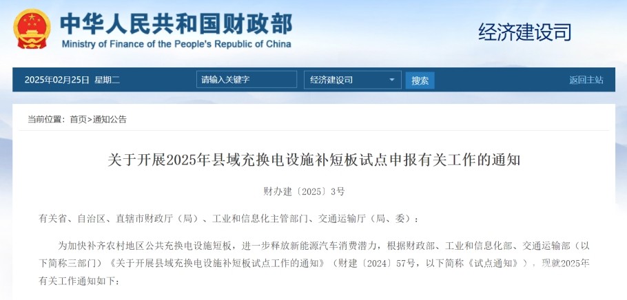 为加快补齐农村地区公共充换电设施短板,进一步释放新能源汽车消费潜力,根据财政部、工业和信息化部、交通运输部(以下简称三部门)《关于开展县域充换电设施补短板试点工作的通知》(财建〔2024〕57号,以下简称《试点通知》),现就2025年有关工作通知如下: