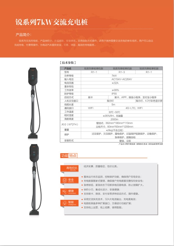 产品体积小,外观精致,安装便捷,采用自助式操作,适用于各种需要交流充电的停车场所。用户可以自主完成充电、付费等操作,为电动汽车提供安全、可靠、稳定、高效的充电服务。