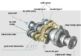 用于客车的12档ASTronic变速箱采用双副轴结构,是由一个带倒档的三档主变速齿轮部分、安装在前部的两对常啮合齿轮和安装在后部的高低档选择行星齿轮组构成。其齿轮组可视为2×3×2结构。