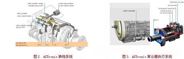ASTronic变速箱系统是由变速箱本体和实现自动换档的控制部件组成。变速箱和离合器的执行机构都是集成在变速箱上的。其它设备,如档位选择器、显示器和E模块等安装在车辆上。ASTronic通过CAN总线与整车的控制网络系统通讯。