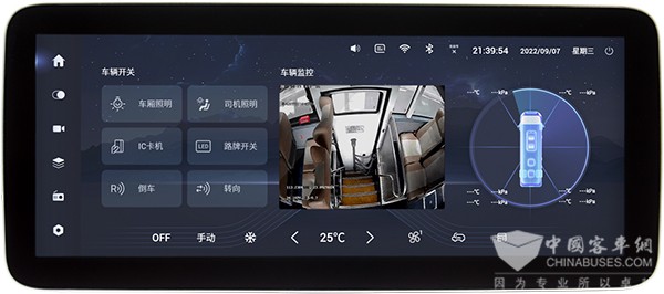随着车载设备越来多,公交车上涉及到的显示屏至少5个以上,例如:倒车监控显示、360显示、雷达显示、胎压显示、调度显示、主动安全预警显示、烟雾报警器显示等,这么多的显示屏不利于司机观看,还存在重复建设的问题。另外一个方面,客车正朝着轻量化、智能化、信息化的方向发展,客户需要一款能够打通不同设备进而将不同的设备信息进行融合显示的智能显示屏。此外客车的仪表台也朝着一体化、极简化设计,乘用车已经将很多车辆控制按键虚拟在中控屏显示,公交车作为一个特殊的驾驶场景,不能完全照抄乘用车将按键完全虚拟化的思路,但是可以将一些操作频次不高的控制按钮如司机灯、空调、路牌等开关集成到中控屏。