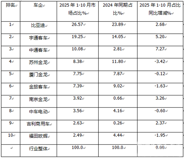 表4,根据中国客车统计信息网数据,2025年1-10月前10车企累计出口占比及占比同比增减: