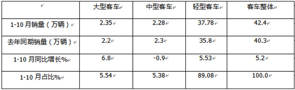 ---大型客车销售0.26万辆,同比增长30%,跑赢并领涨国内客车大盘(7%);市场占比5.65%。据分析主要是10月正值国庆和中秋“双节”来临的前期,旅游市场旺盛,市场对大型公路客车需求增多所致。