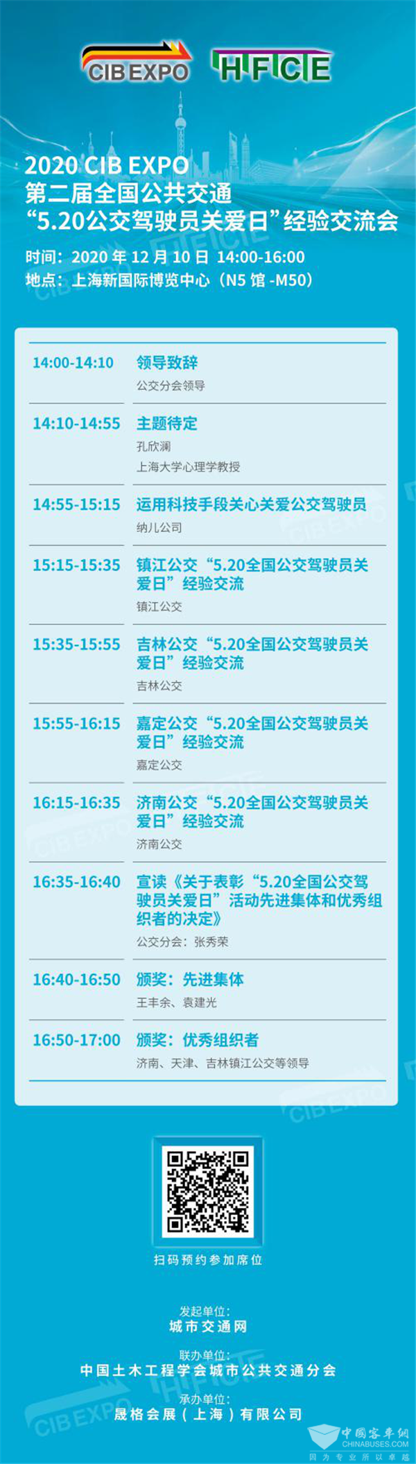 本届经验交流会作为“CIB EXPO 2020上海国际客车展”的同期重要会议之一,旨在希望通过本次活动,让大家更走近公交同行,共同营造全社会关注、理解、尊重公交驾驶员的良好风尚,共建关心、关爱公交驾驶员的和谐氛围。会议将汇聚国内优秀公交公司,围绕优势互补、互惠互利、相互促进、共同发展等双赢方向,进行深入探讨和交流。