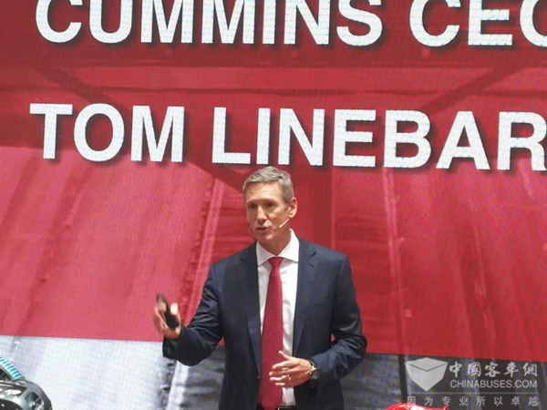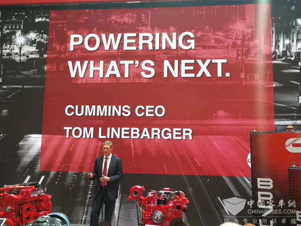 康明斯公司董事长兼首席执行官兰博文(Tom Linebarger)向来宾介绍康明斯包括清洁柴油和电动在内的多元能源动力解决方案