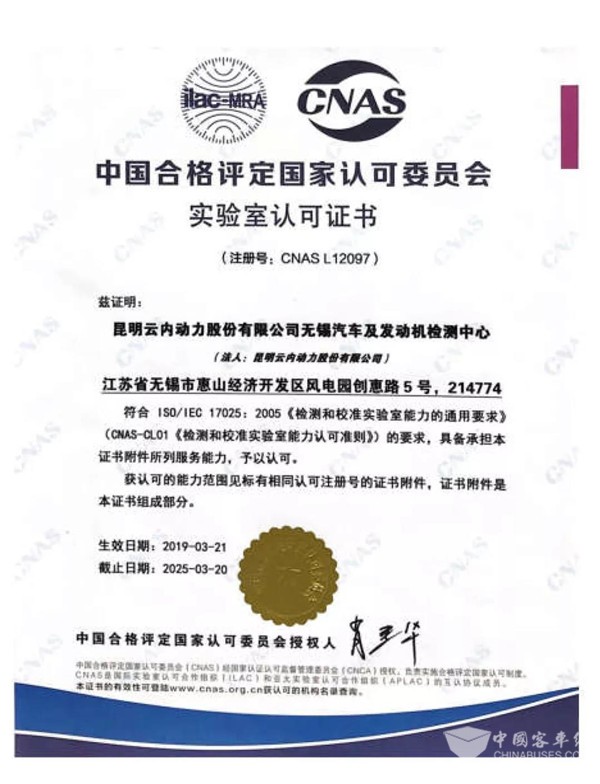 近日,“昆明云内动力股份有限公司无锡汽车及发动机检测中心”获得CNAS实验室认可,允许使用CNAS认可标识、ILAC-MRA/CNAS标识和声明认可状态。实验室认可是由中国合格评定国家认可委员会(英文简称CNAS)对检测、 校准实验室及其人员有能力进行规定类型的检测、校准所给予的正式承认。