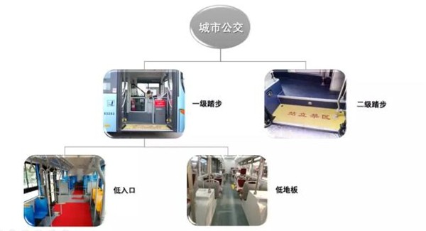 城市公交车可根据踏步的多少分为一级踏步和二级踏步,通俗地讲,乘客进入一辆公交车时,如果只需要迈一步,那么他所乘的便是一级踏步车,如果要上两级台阶,所乘的便是二级踏步车,其中一级踏步车主要有低地板、低入口两种车型。(如图)