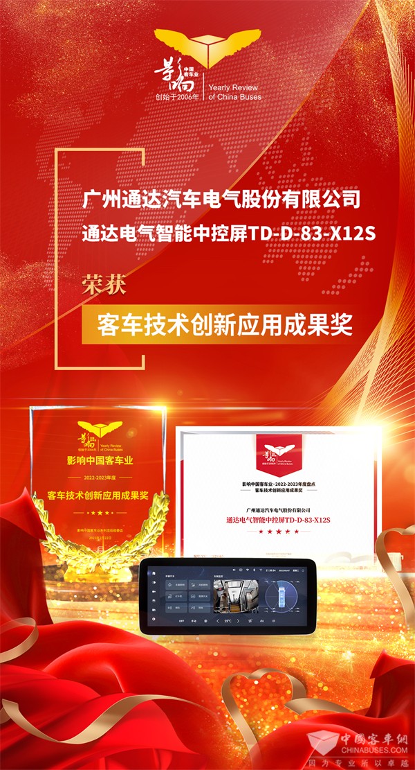 从柴油动力到纯电驱动、从数据分析到车辆诊断、从人机交互到智能驾驶……技术的发展与迭代无疑为客车业带来了崭新的发展机遇。影响中国客车业年度盘点活动中,广州通达汽车电气股份有限公司(以下简称:通达电气)旗下产品智能中控屏TD-D-83-X12S(下称“X12S”)因其“智能化技术创新应用匹配客车技术发展”脱颖而出,荣获“技术创新应用成果奖”奖项。