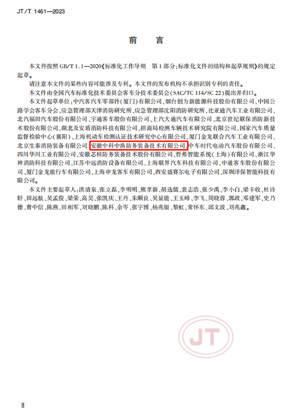 由中科中涣参与起草的JT/T 1461-2023《客车锂离子动力蓄电池箱火灾防控装置配置要求》行业标准,已于2023年01月19日由中华人民共和国交通运输部发布,于2023年7月19日起正式实施。该《标准》由全国汽车标准化技术委员会客车分技术委员会(SAC/TC114/SC22)提出并归口,由中国公路学会客车分会、应急管理部天津消防研究所、安徽中科中涣智能装备股份有限公司等20多家企业单位起草。