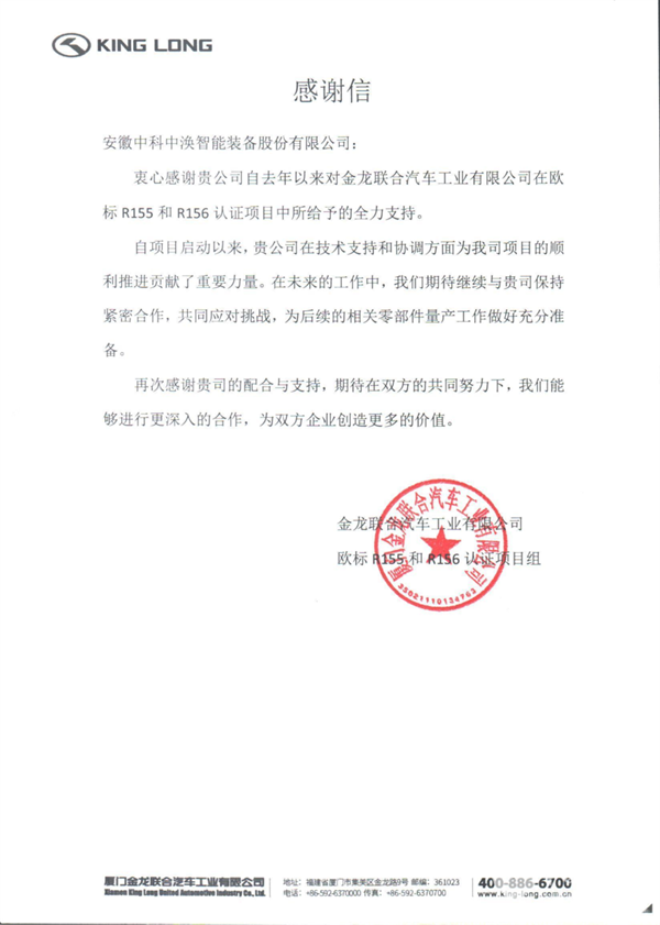 优质履约获赞!中科中涣获厦门金龙客车感谢信