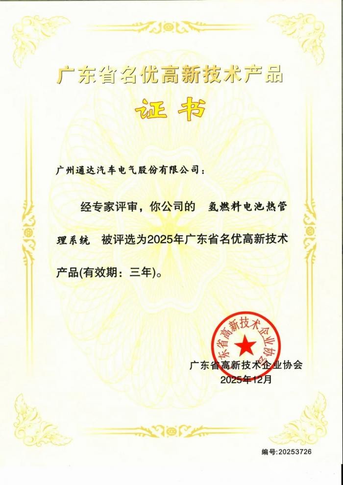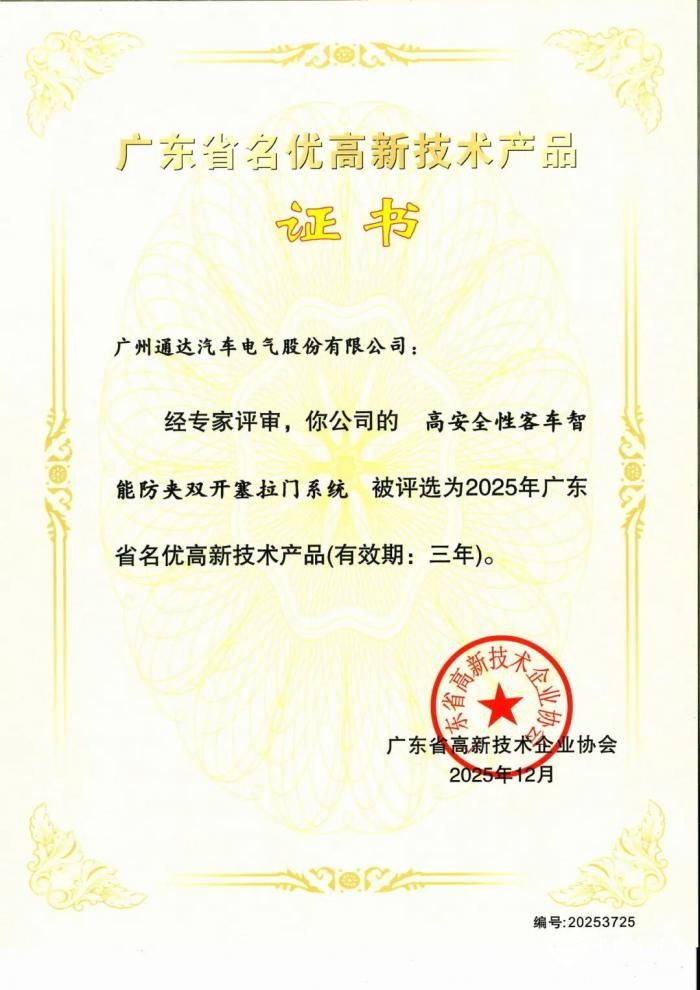 乐竞(中国)体育官方网站2025年12月25日获悉,广东省高新技术企业协会正式公布2025年广东省名优高新技术产品评选结果。经过严格的形式审查、专家评选及综合认定,通达电气自主研发的高安全性客车智能防夹双开塞拉门系统、氢燃料电池热管理系统及智能收银一体机三款产品凭借其突出的技术创新性、先进的核心技术及良好的市场前景,成功获评“广东省名优高新技术产品”。