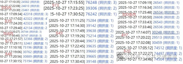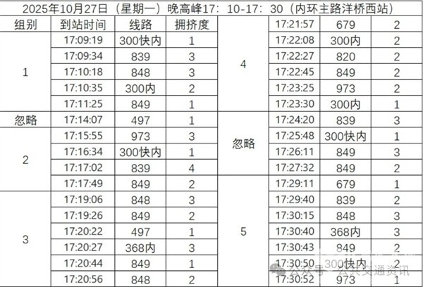 这里我们以北京市南三环内环主路的洋桥西站为例,利用北京实时公交数据库导出了在该站台停靠的11条线路(943除外)在2025年10月27日(星期一)晚高峰17:10到17:30区间的到站情况,如下图所示: