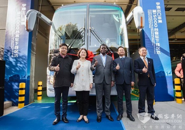 就在当天的访问活动中,宇通出口非洲的第15000辆客车正式下线,非洲使节团在亲眼见证了这一重要时刻后为宇通客车竖起了大拇指。